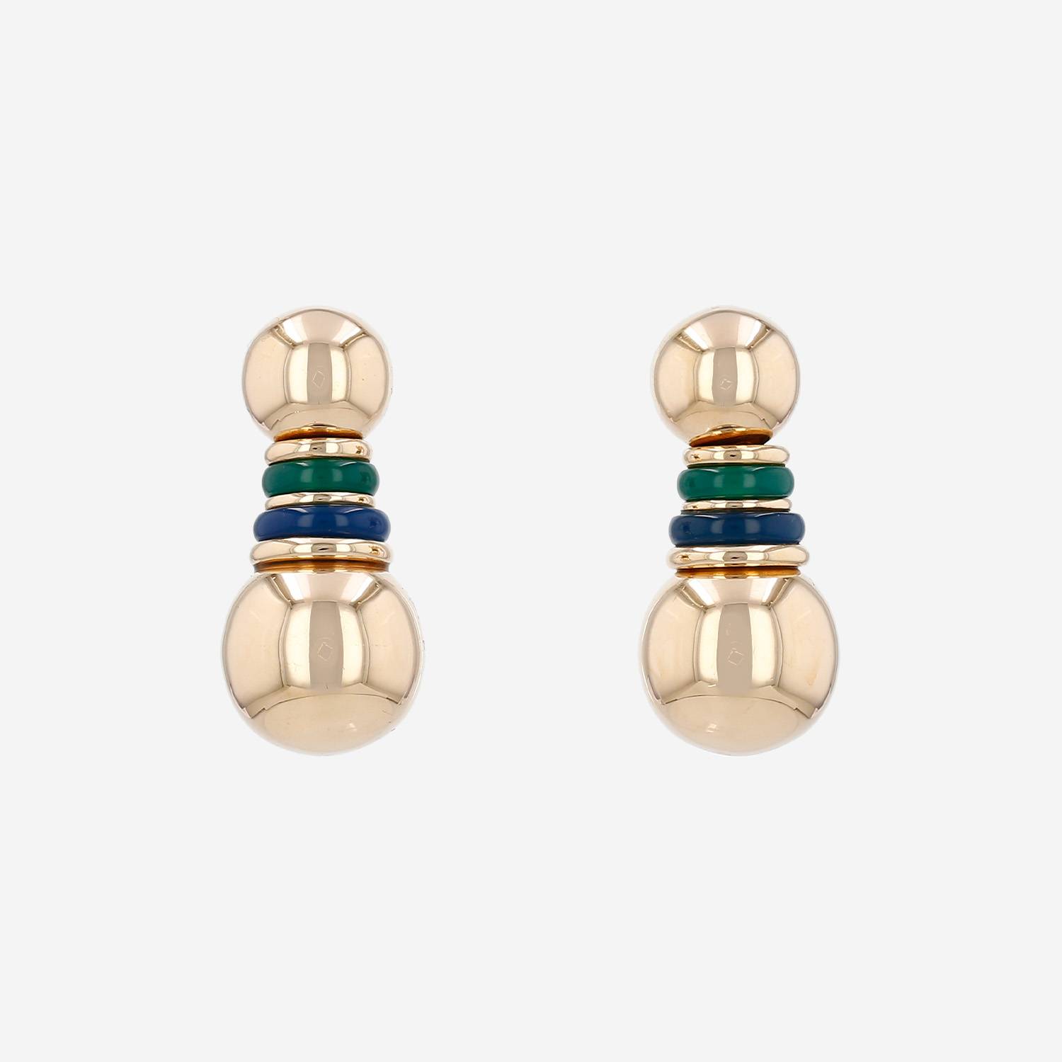 Pendientes Boucheron de oro amarillo de ágata azul, y en crisoprasa, compuestos de una superposición de 2 perlas de oro amarillo, que sujeta en el centro de preciosos anillos de ágata azul y de crisoprasa.
