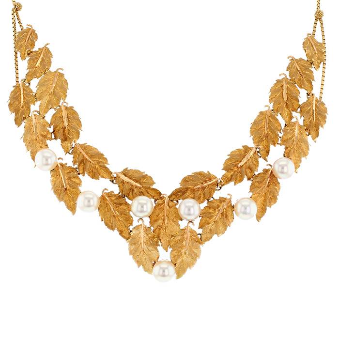 Collar ajustado Buccellati de oro amarillo guilloché y perlas, compuesto de una sucesión de muy bonitas hojas texturadas de oro amarillo, realzado de 7 perlas, todo ello sujetado por una cadena de oro amarillo.
