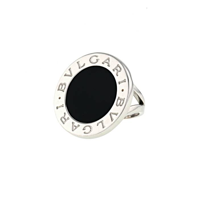Magnífica sortija de la colección "Bulgari Bulgari" modelo grande de oro blanco y ónix, compuesta de un importante disco grabado "Bvlgari Bvlgari", adornada en el centro de una elegante placa redonda de ónix.