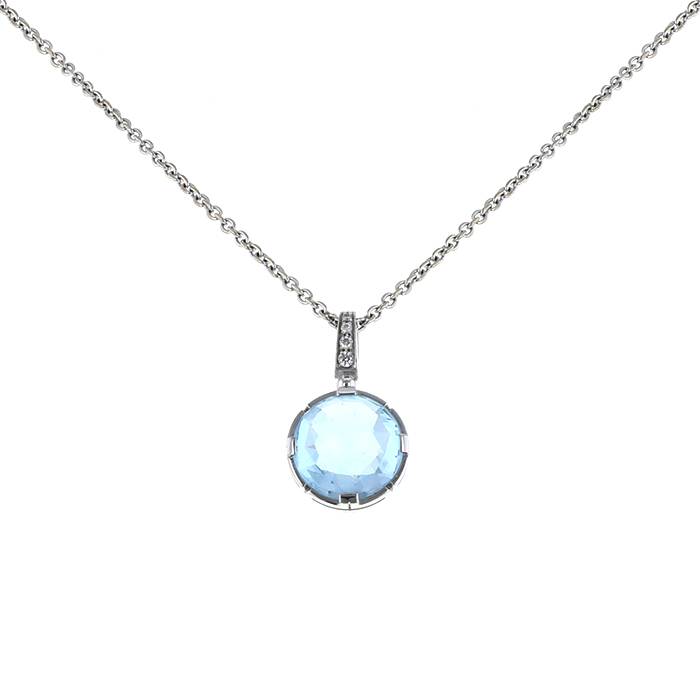 Magnífico collar Bulgari Parentesi de oro blanco, de topacio azul y de diamantes, compuesto de una delicada cadena de eslabones redondos de oro blanco, que sujeta en el centro un bonito diseño redondo calado de oro blanco parcialmente engastado de diamantes de talla brillante, realzado en el centro de un magnífico cabujón redondo facetado de topacio azul.