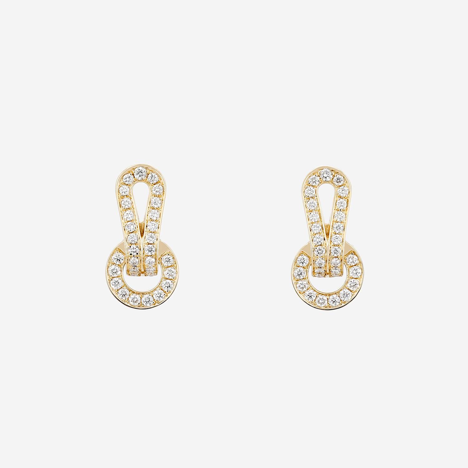Magníficos pendientes Cartier Agrafe de oro amarillo y diamantes, en los cuales figura una elegante hebilla geométrica calada enteramente pavimentada de diamantes de talla brillante en total 1.24 quilate.