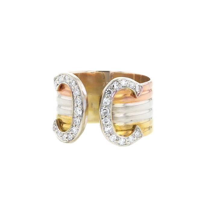 Elegante sortija abierta Cartier C de Cartier modelo grande de 3 oros y diamantes, compuesta de una elegante cinta gallonada de oro amarillo, de oro blanco y de oro rosa, realzada en el centro del intemporal doble C Cartier de oro blanco delicadamente engastada de diamantes de talla brillante.