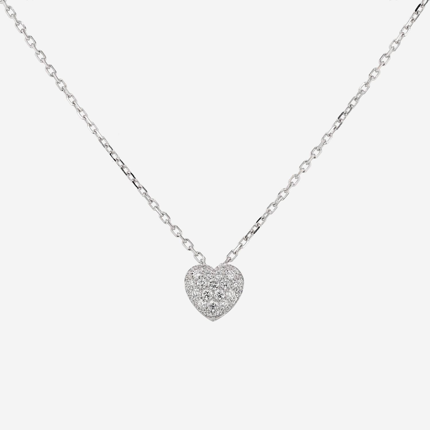 Colgante Cartier Coeur et Symbole de oro blanco y diamantes, que forma un precioso pequeño corazón abombado de oro blanco, adornado de un magnífico engaste de diamantes de talla brillante pesando de aproximadamente 0.25 quilate, sujetado por una delgada cadena de eslabones encadenados de oro blanco.