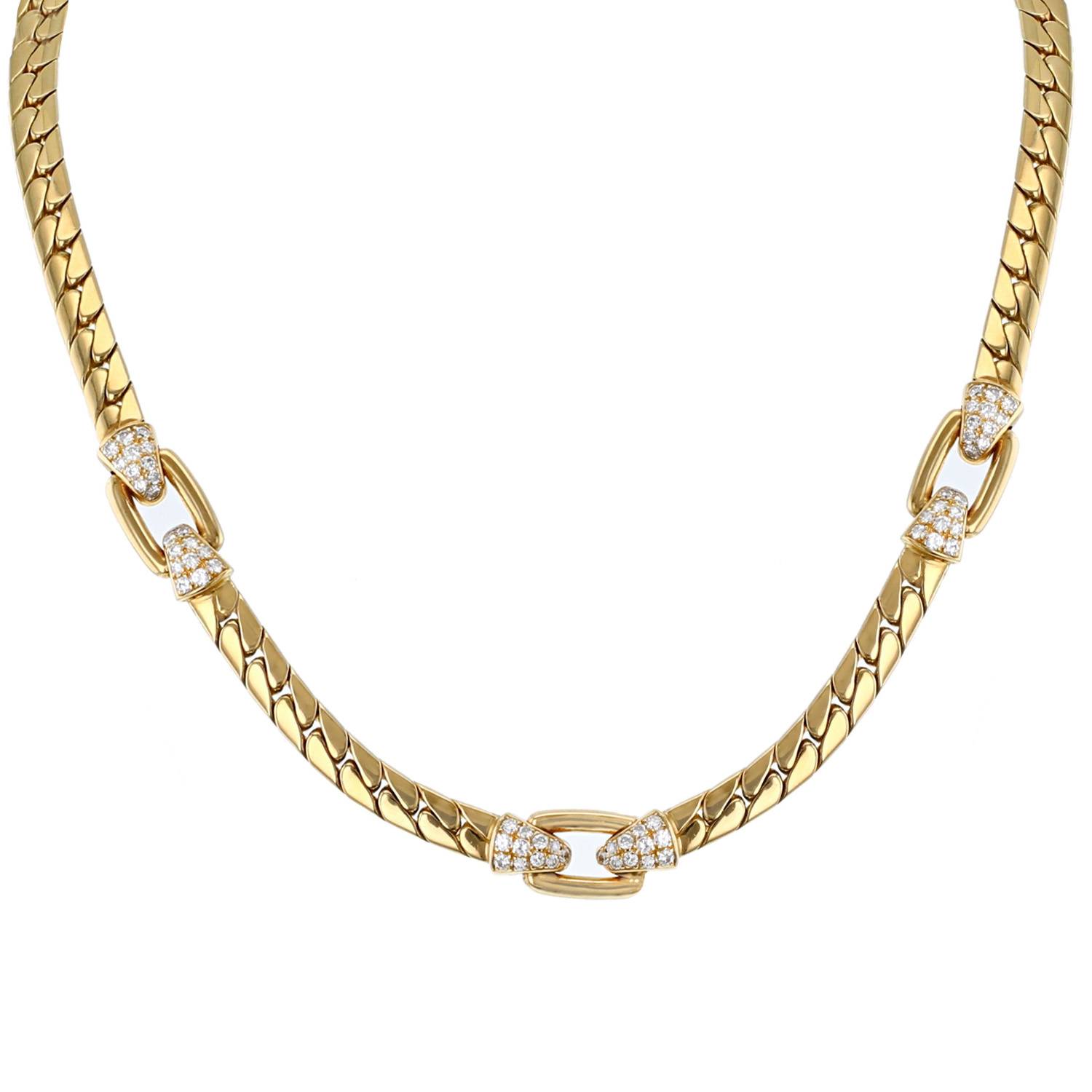 Collar Cartier de oro amarillo y diamantes, compuesto de una elegante malla de oro amarillo, adornado de eslabones articulados calados rodeados de motivos abombados triangulares delicadamente pavimentado de aproxidamente 1 quilate de diamantes de talla brillante.