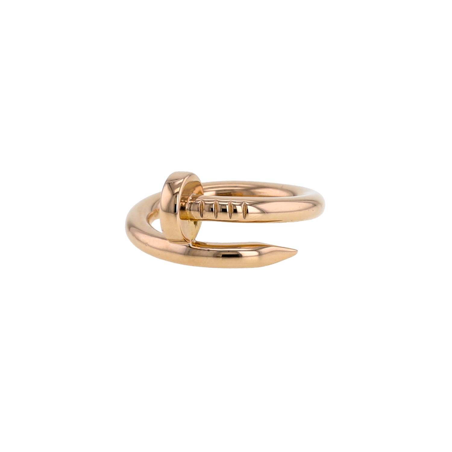 Inconfundible sortija Cartier Juste un clou de oro rosa, en la cual figura un sorprendente clavo enlazado de oro rosa.