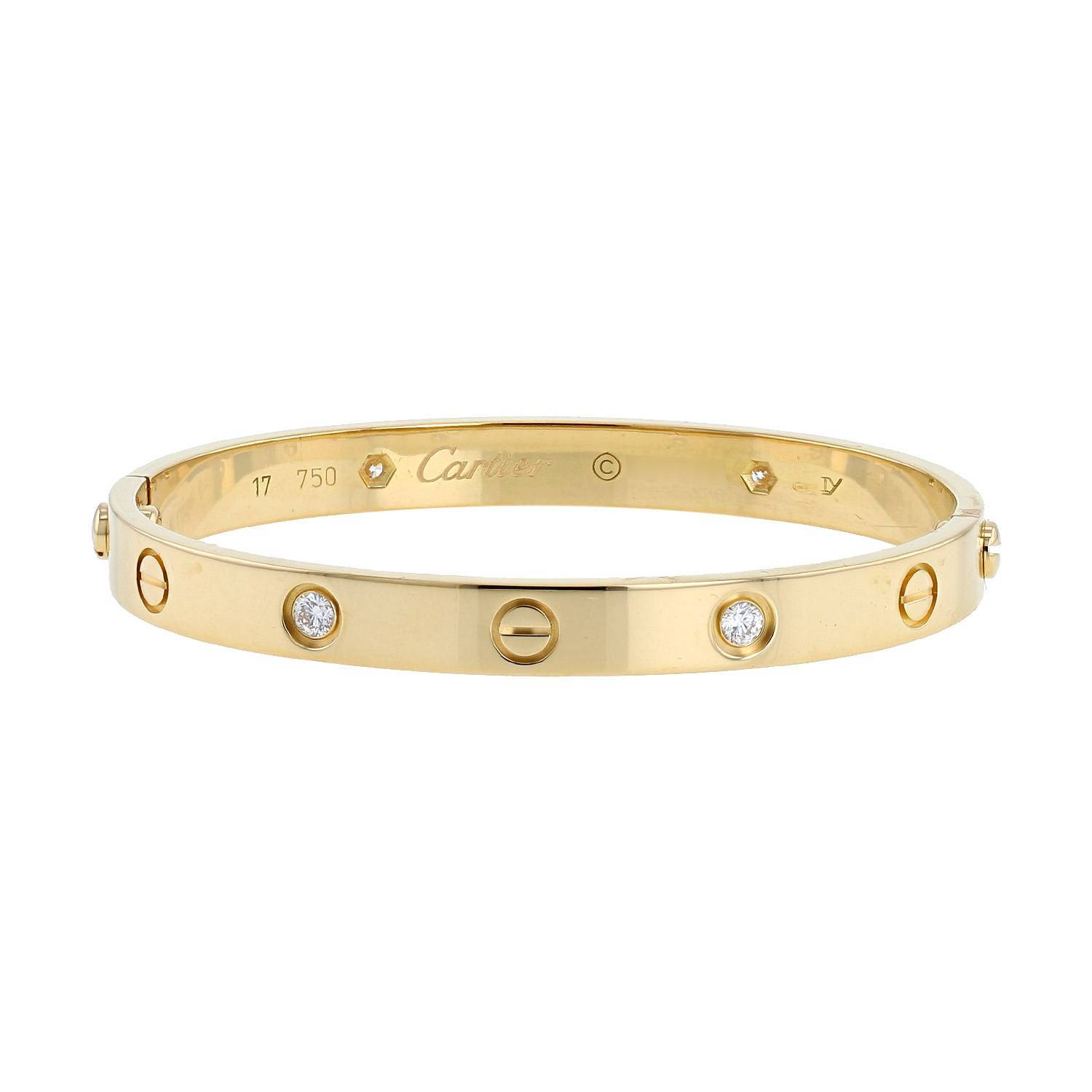 Magnífico brazalete Cartier Love 4 diamants de oro amarillo y diamantes, compuesto de un elegante anillo liso de oro amarillo, adornado de diseños de tornillos grabados de diamante de talla brillante.