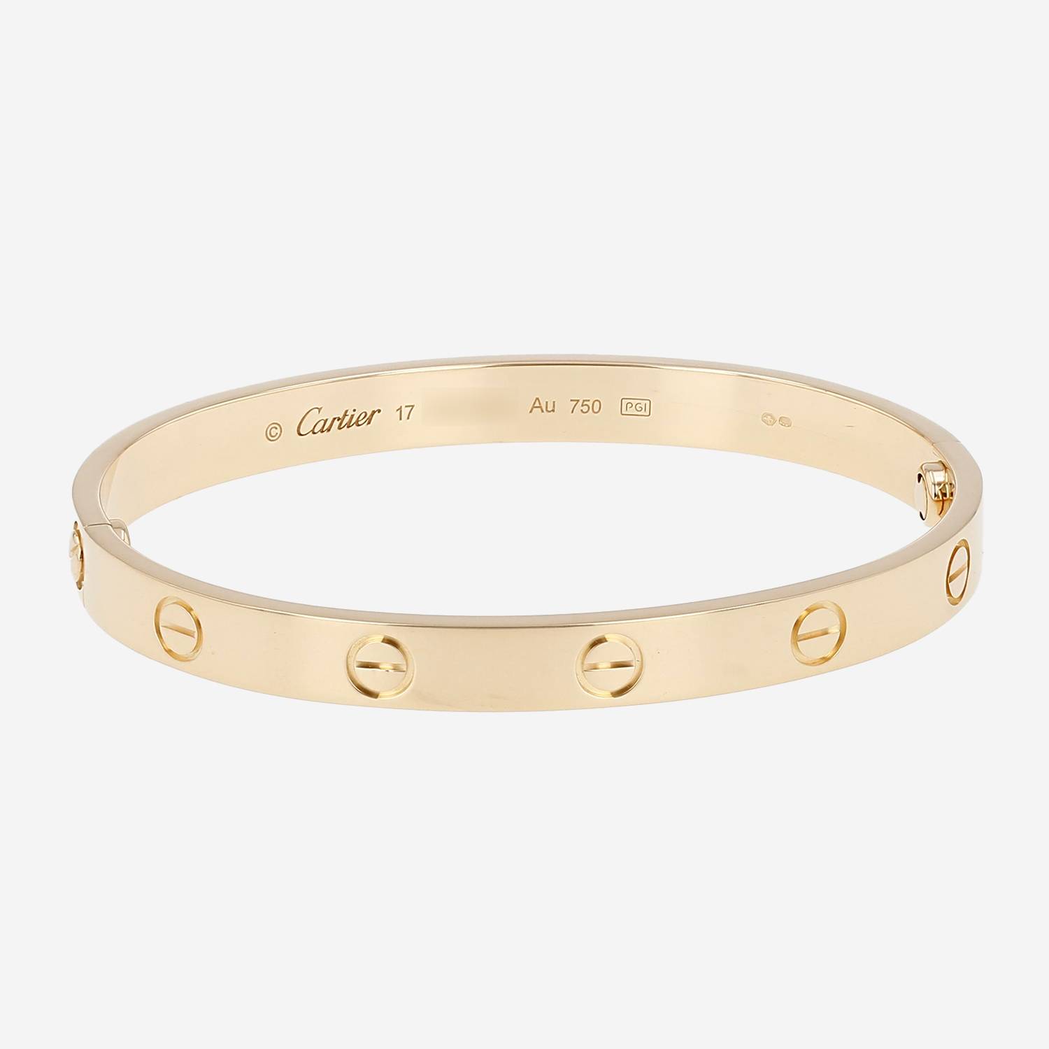 Brazalete Cartier Love de oro amarillo, compuesto de un elegante cinta lisa, adornado de diseños de tornillos grabados.