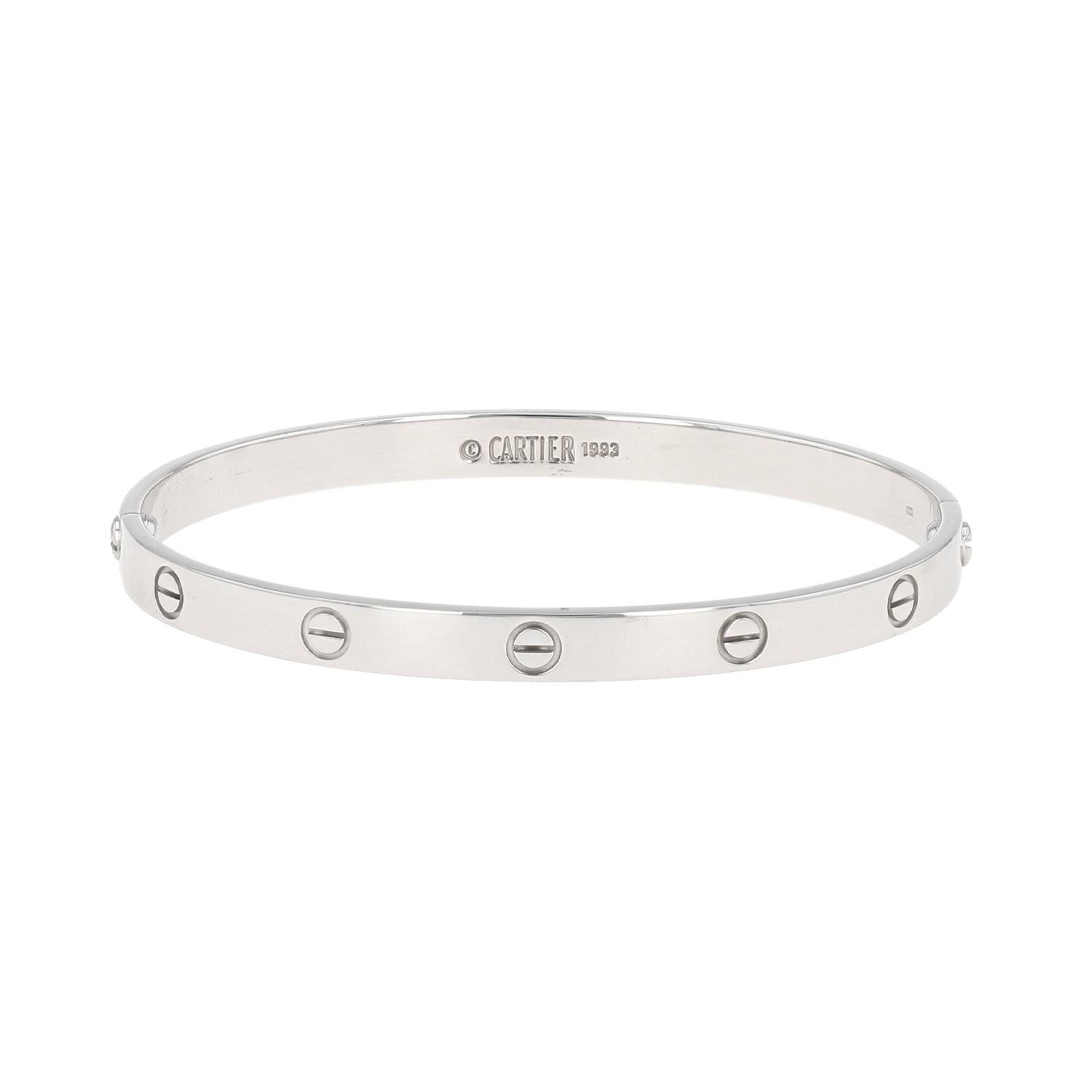 Brazalete Cartier Love de oro blanco, compuesto de un elegante cinta lisa, adornado de diseños de tornillos grabados.