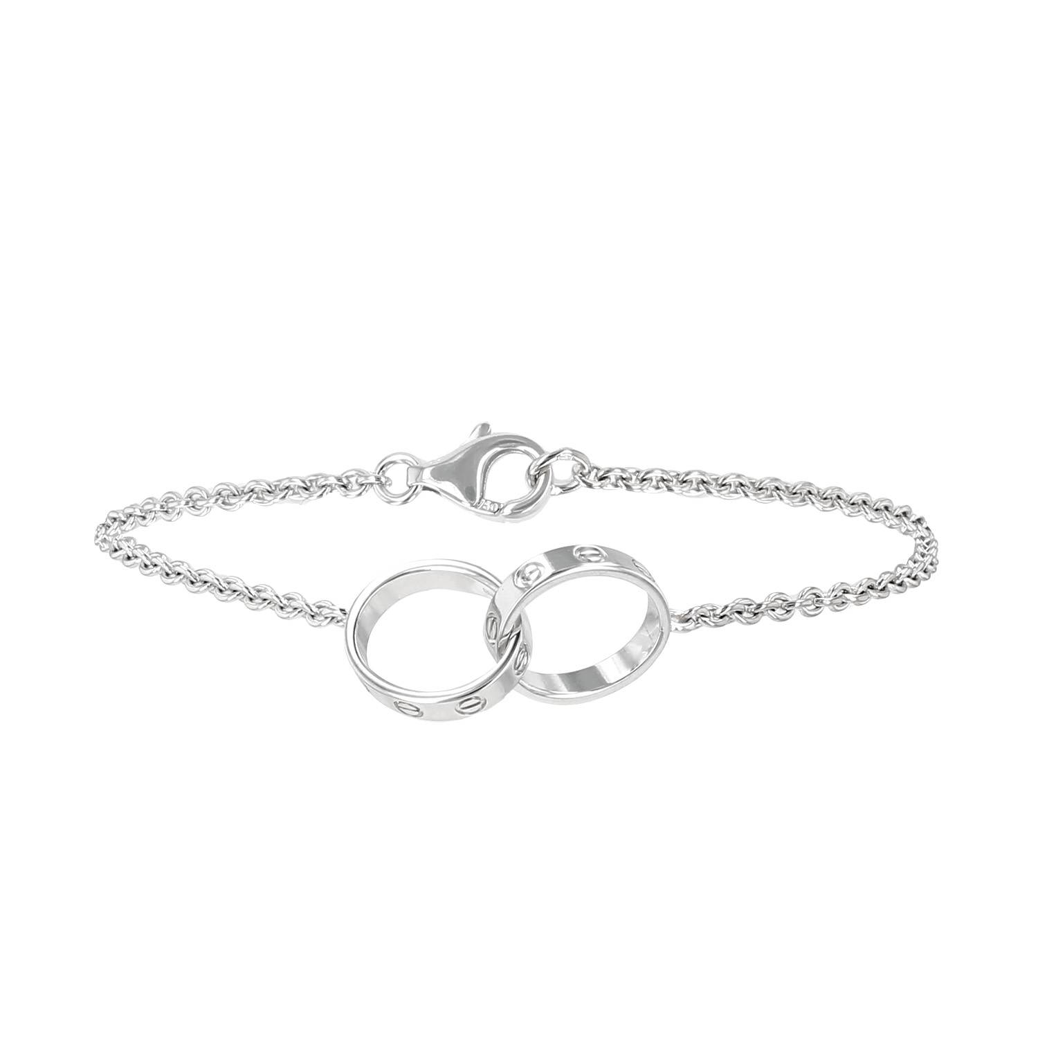 Brazalete Cartier Love de oro blanco, compuesto de 2 elegantes cintas entrelazadas de oro blanco, adornado de diseños de tornillos grabados, todo ello sujetado por una cadena de oro blanco.