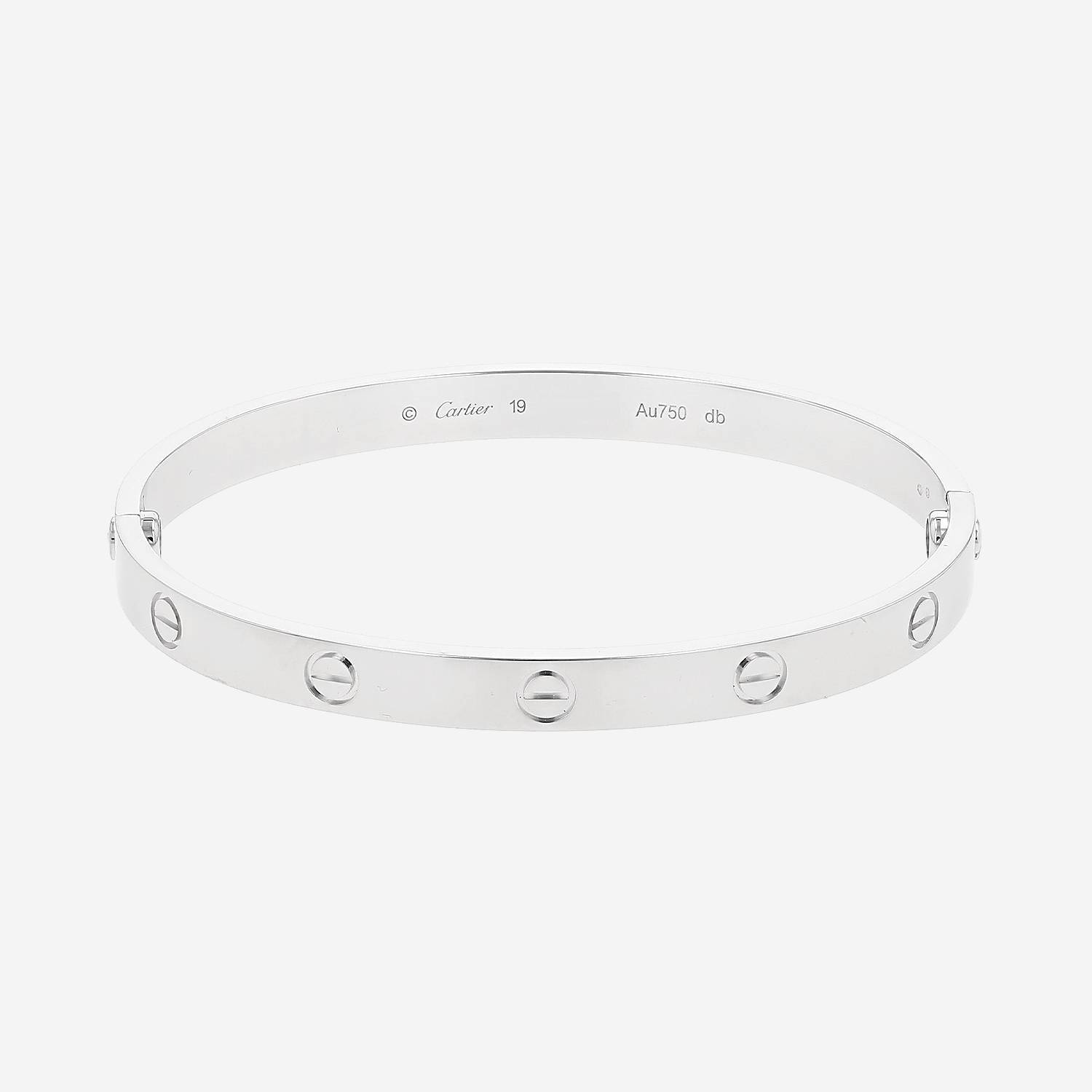 Brazalete Cartier Love de oro blanco, compuesto de un elegante cinta lisa, adornado de diseños de tornillos grabados.