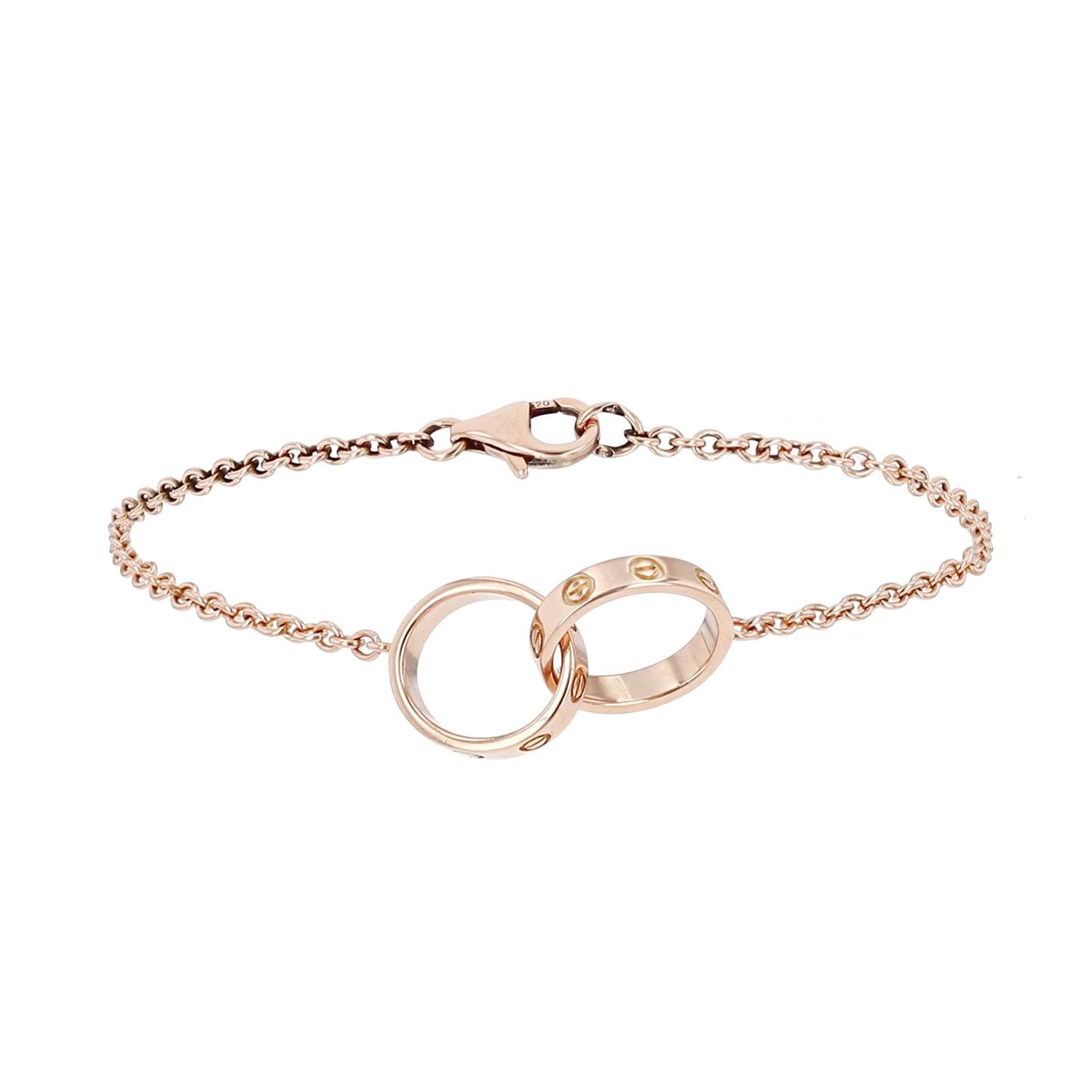 Brazalete Cartier Love de oro rosa, compuesto de un elegante cinta lisa, adornado de diseños de tornillos grabados, todo ello sujetado por una cadena de eslabones encadenados.