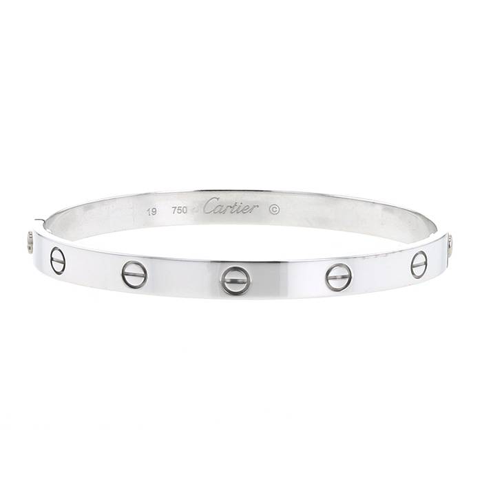 Precioso brazalete Cartier Love de oro blanco, compuesto de un elegante anillo ovalado liso, adornado de diseños de tornillos grabados.