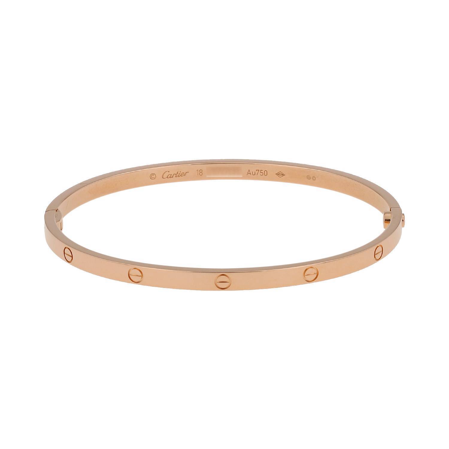 Brazalete Cartier Love modelo pequeño de oro rosa, compuesto de un elegante cinta lisa, adornado de diseños de tornillos grabados.