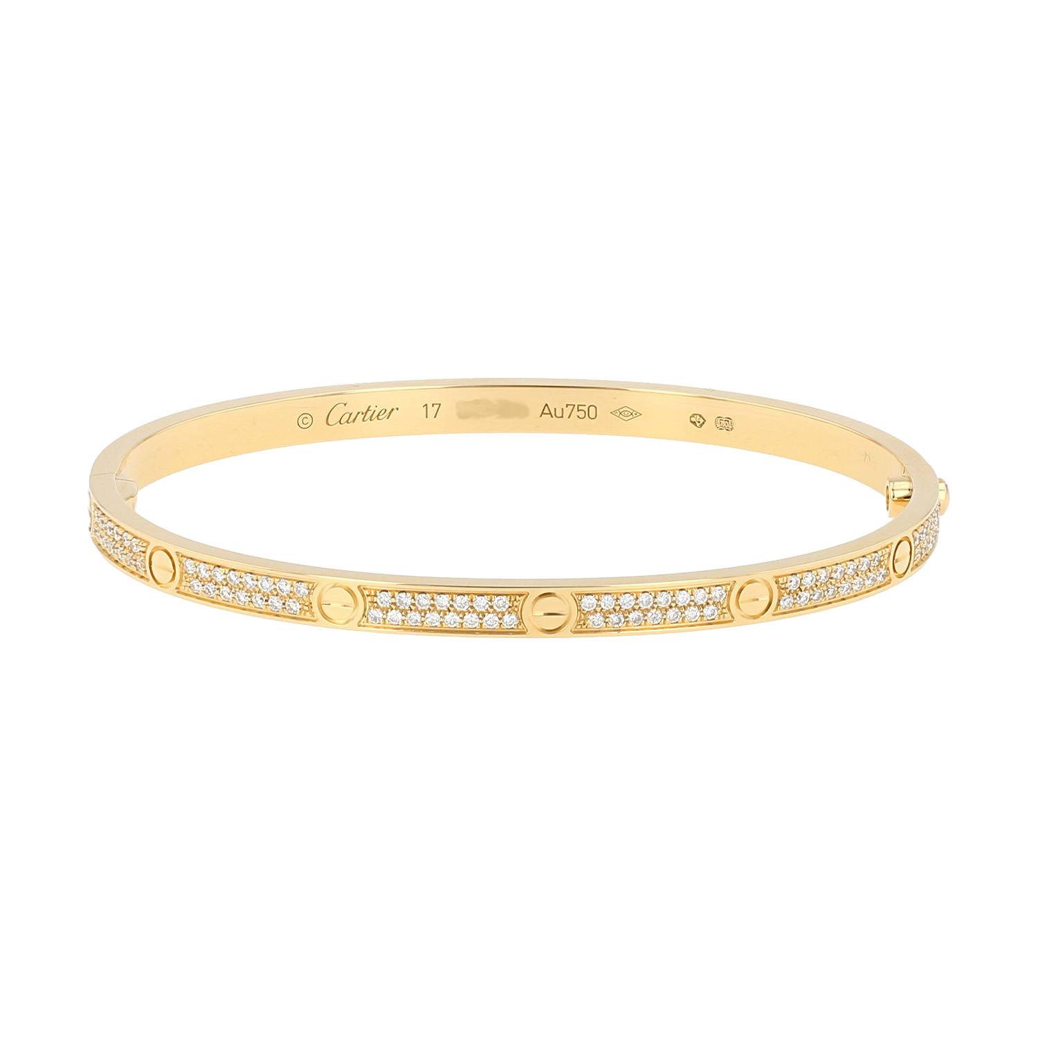 Brazalete Cartier Love pavé modelo pequeño de oro amarillo y diamantes, compuesto de un elegante anillo que se puede abrir de oro amarillo, adornado de magníficos diamantes de talla brillante pesando en total 0.95 quilate, realzado de diseños de tornillos grabados.