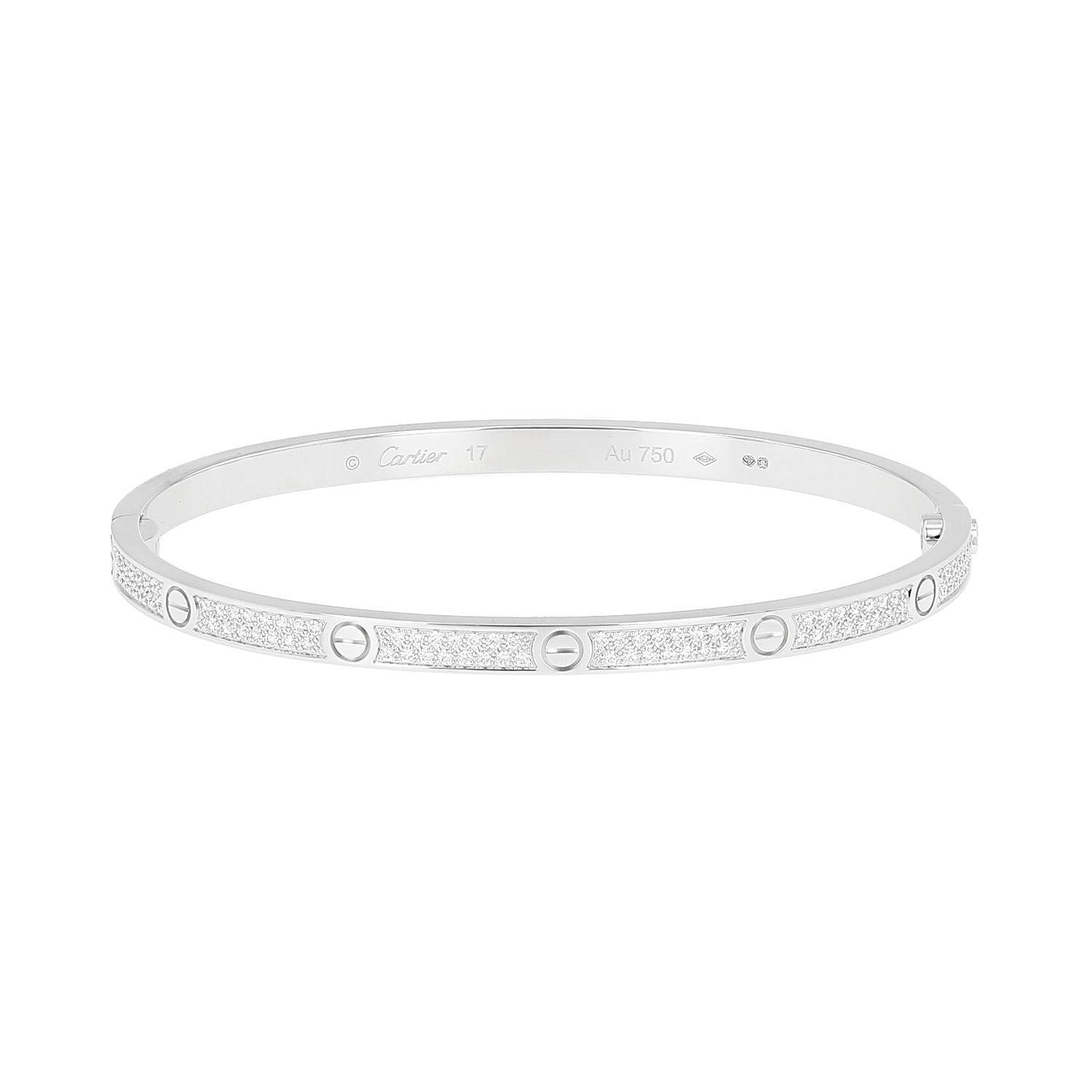 Brazalete Cartier Love pavé modelo pequeño de oro blanco y diamantes, compuesto de un elegante anillo que se puede abrir de oro blanco, adornado de un engaste de diamantes de talla brillante.