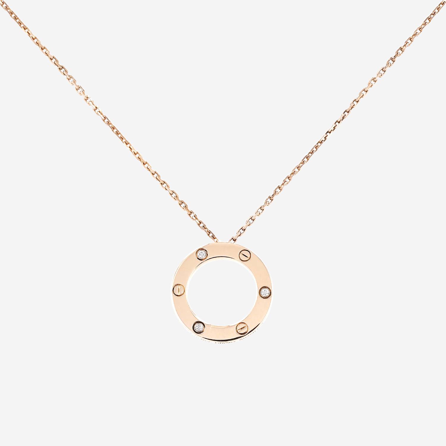 Colgante Cartier Love de oro rosa y diamantes, compuesto de un elegante diseño redondo de oro rosa, adornado de diseños de tornillos grabados engastados de diamantes de talla brillante, sujetado por una bonita cadena de eslabones encadenados de oro rosa.
