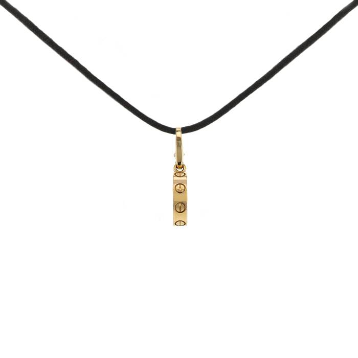 Precioso colgante Cartier Love de oro amarillo, compuesto de una elegante cinta lisa, adornado de 7 diseños de tornillos grabados, realzado de una elegante argolla articulada de oro amarillo, todo ello sujetado por un bonito cordón de nylon negro.