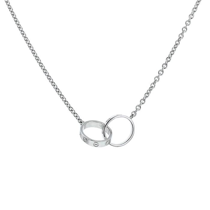 Collar Cartier Love de oro blanco, compuesto de 2 elegantes anillos enlazados de oro blanco, adornado de elegantes diseños de tornillos grabados, todo ello sujetado por una delgada cadena de oro blanco.