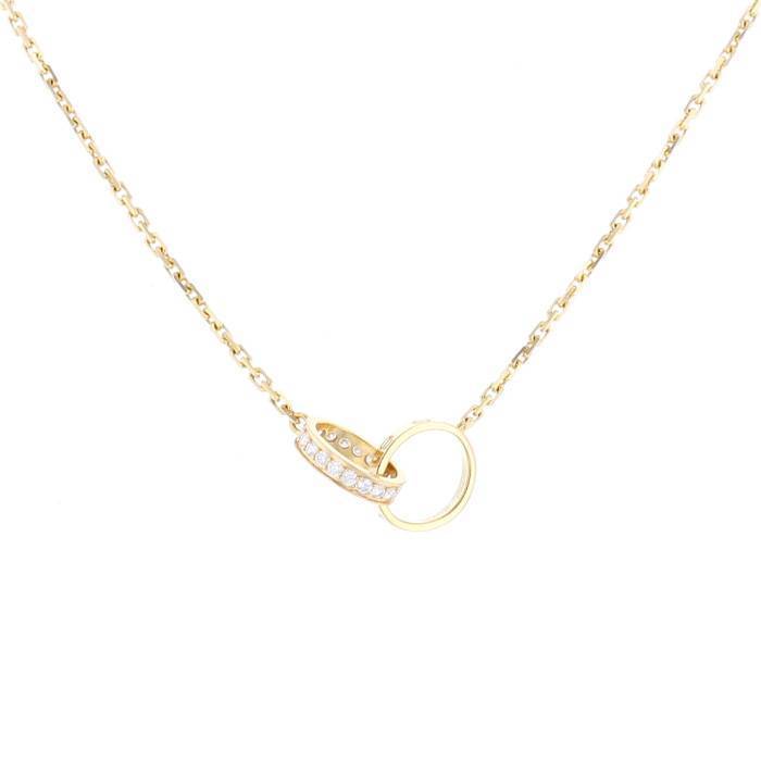 Collar Cartier Love de oro rosa y diamantes, compuesto de 2 elegantes cintas entrelazadas de oro rosa parcialmente engastadas de diamantes de talla brillante, adornado de diseños de tornillos grabados, todo ello sujetado por una cadena de eslabones encadenados de oro rosa.