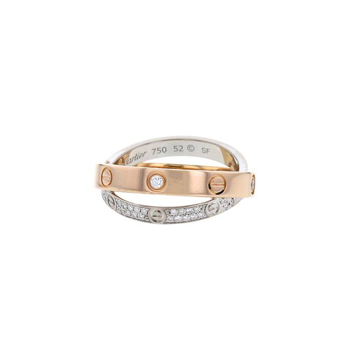 Muy bonita sortija Cartier Love Astro de oro rosa, de oro blanco y de diamantes, compuesta de 2 bonitos anillos asimétricos de oro rosa, de oro blanco, adornada de diseños de tornillos grabados, realzada de bonitos diamantes de talla brillante en total 0.20 quilate.