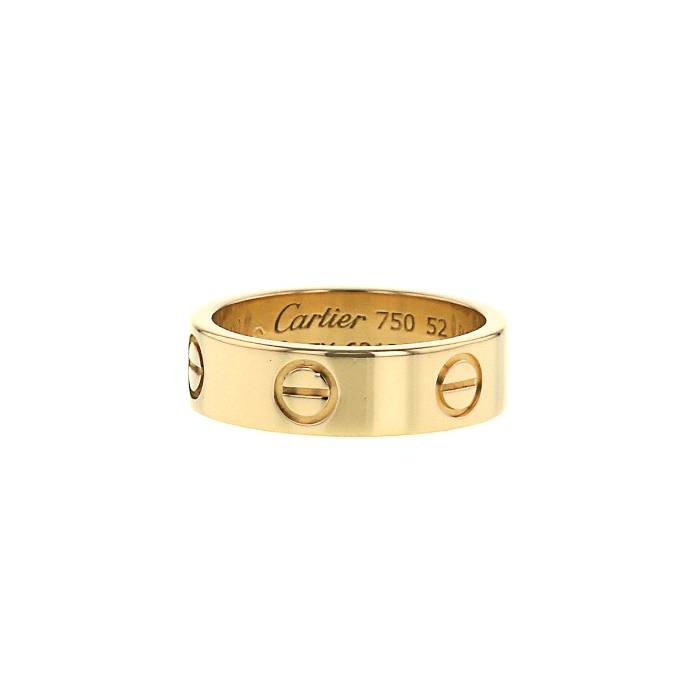 Preciosa sortija Cartier Love modelo pequeño de oro amarillo, compuesta de una elegante cinta lisa de oro amarillo, adornada de 6 diseños de tornillos grabados.