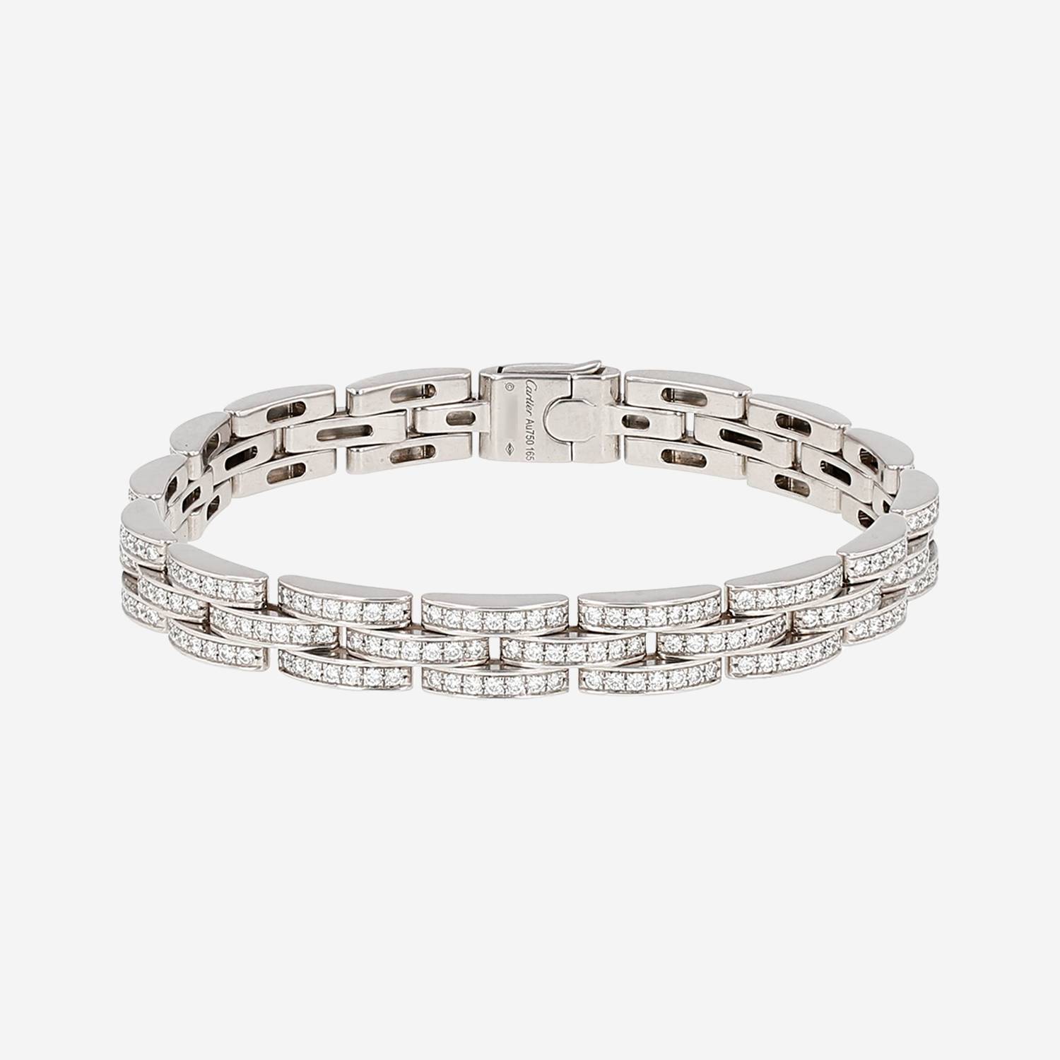 Elegante brazalete articulado Cartier Maillon Panthère de oro blanco y diamantes, compuesto de una sucesión de preciosos eslabones abombados articulados de oro blanco, adornado de un magnífico engaste de diamantes de talla brillante pesando en total 2.41 quilates.