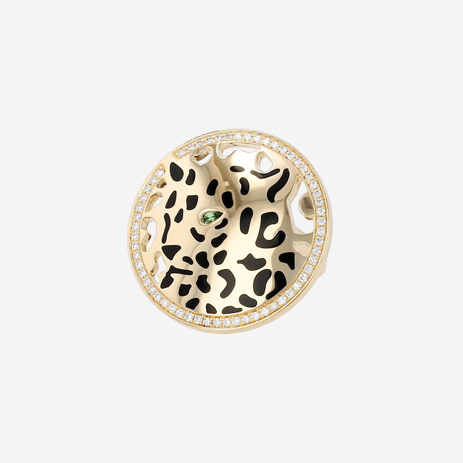 Sortija Cartier Panthère de oro amarillo, de diamantes, y en laca negra, compuesta de un disco calado de oro amarillo delicadamente engastado de diamantes de talla brillante, adornada de una pantera delicadamente engastada de un tsavoritas realzada de un pelaje de pantera de laca.