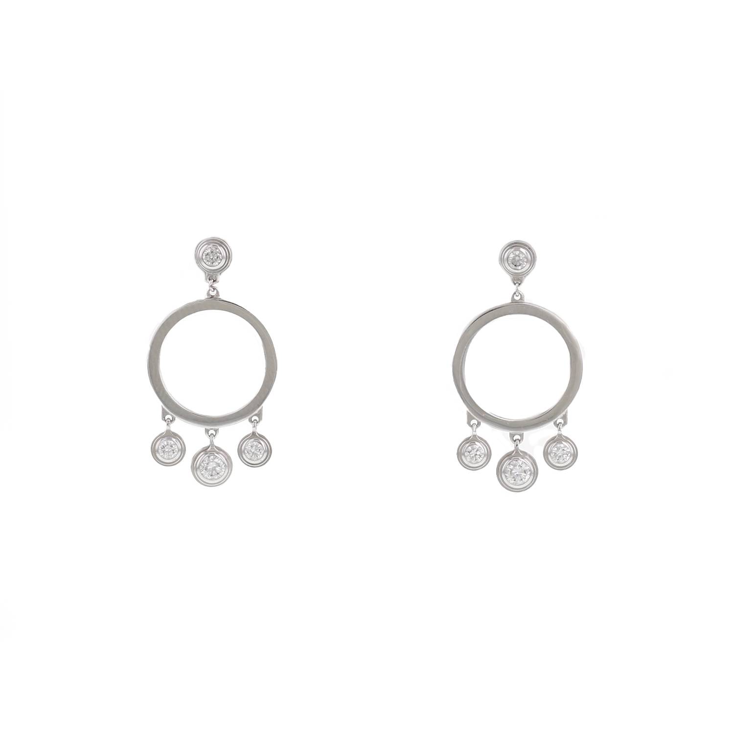 Pendientes Cartier de oro blanco y diamantes, elegantemente engastados de diamantes de talla brillante, compuestos de motivos redondos articulados calados de oro blanco, que sujeta colgantes delicadamente engastados de diamantes de talla brillante.