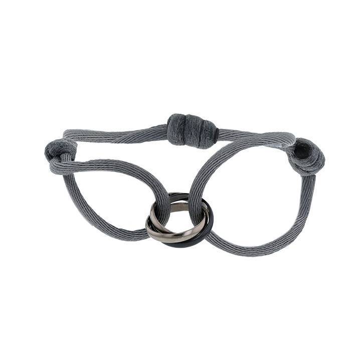Brazalete Cartier Trinity de oro blanco y cerámica, compuesto de una sucesión de 3 elegantes anillos entrelazados de oro blanco, de cerámica negra, todo ello sujetado por un cordón de nylon gris.