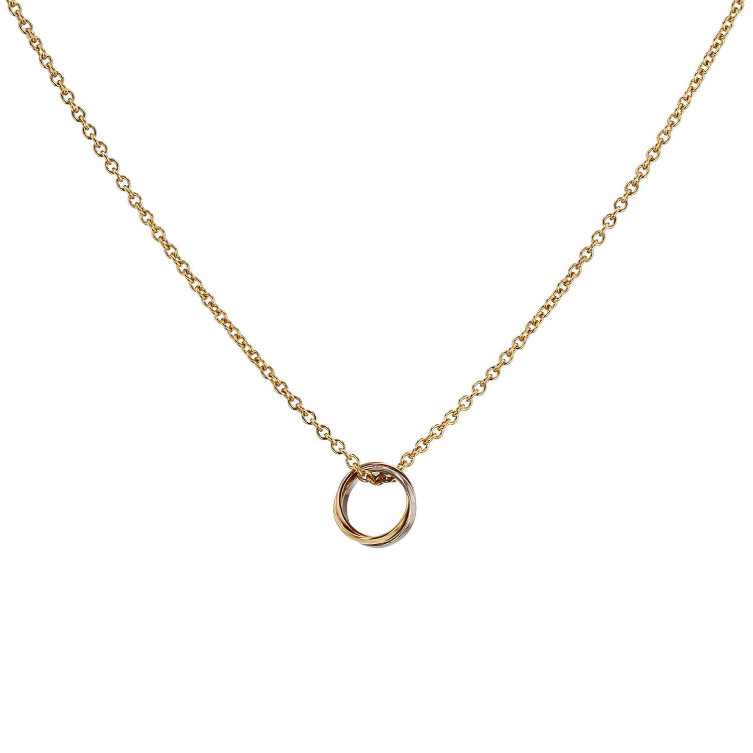 Collar Cartier Trinity de 3 oros, compuesto de una sucesión de 3 elegantes anillos entrelazados de oro amarillo, de oro rosa y en oro blanco, sujetado por una cadena de eslabones encadenados de oro amarillo.