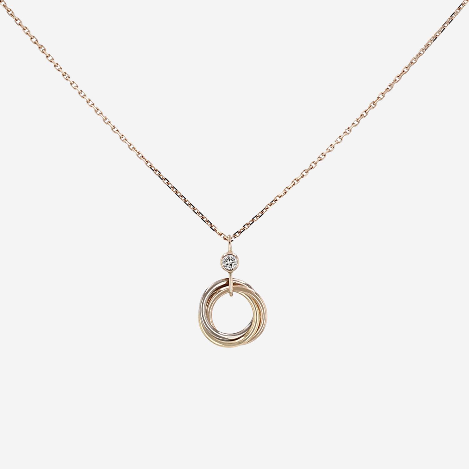 Collar Cartier Trinity de 3 oros y diamante, compuesto de una sucesión de 3 elegantes anillos entrelazados de oro amarillo, de oro rosa y en oro blanco, adornado en la parte superior de un diamante de talla brillante pesando de aproximadamente 0.05 quilate engastado cerrado, todo ello sujetado por una cadena de eslabones encadenados de oro rosa.