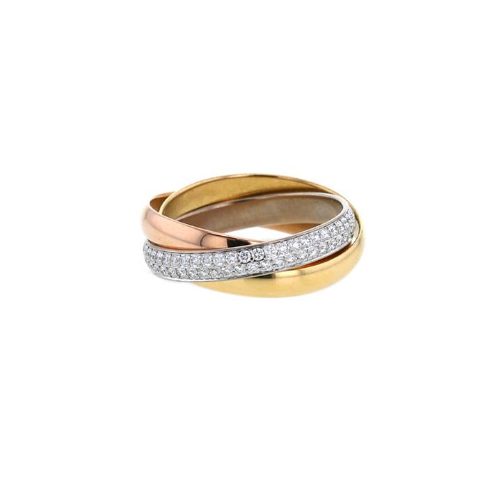 Intemporal sortija Cartier Trinity modelo pequeño de 3 oros y diamantes, compuesta de una sucesión de 3 elegantes anillos entrelazados de oro amarillo, de oro rosa y en oro blanco delicadamente engastados de diamantes de talla brillante 0.45 quilate de de aproximadamente.