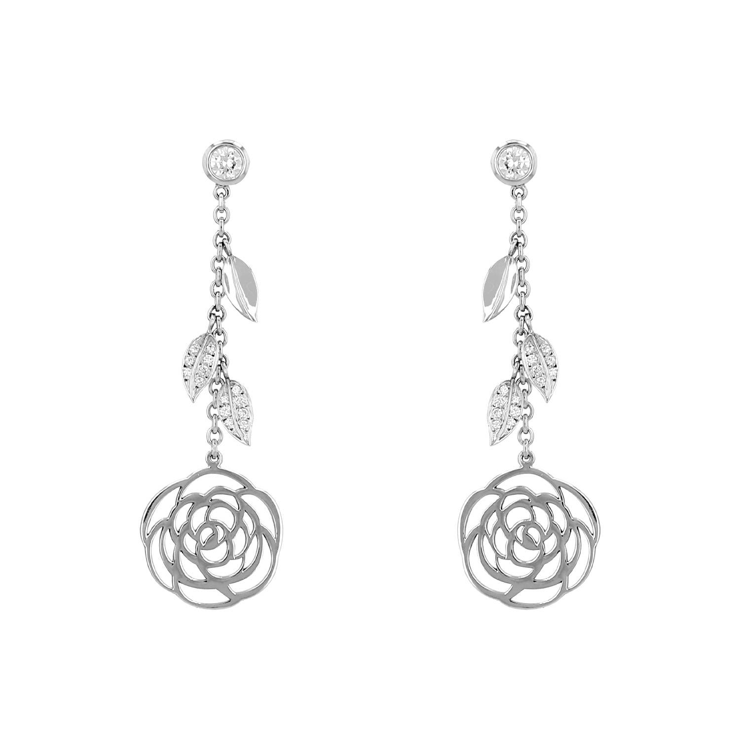 Pendientes colgantes Chanel Camelia de oro blanco y diamantes, en los cuales figura de delicada camelia calada de oro blanco, realzados de hojas de oro blanco delicadamente engastadas de diamantes de talla brillante, todo ello sujetado por cadena de oro blanco.