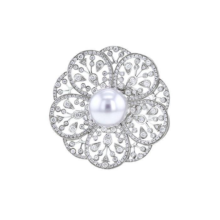 Sortija Chanel Camélia Dentelle de oro blanco, de diamantes, y en perla cultivada blanca, en la cual figura de una importante camelia calada, de oro blanco enteramente engastada de 295 diamantes de talla brillante 3 quilates de en total, adornada en el centro de una magnífica perla cultivada, realzada de un elegante anillo ondulado de oro blanco.