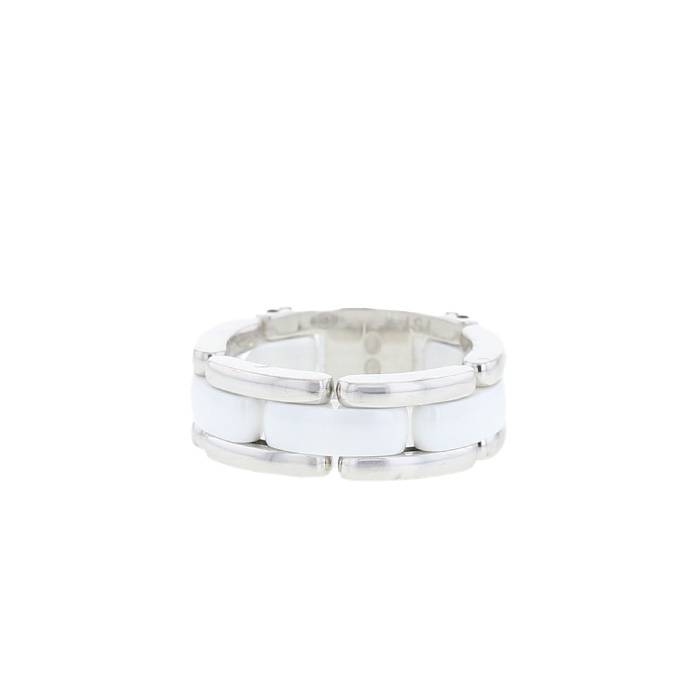 Sortija Chanel de oro blanco y cerámica blanca, compuesta de una sucesión de eslabones rectangulares articulados de cerámica blanca, realzada en los bordes de una sucesión de eslabones de oro blanco articulés.