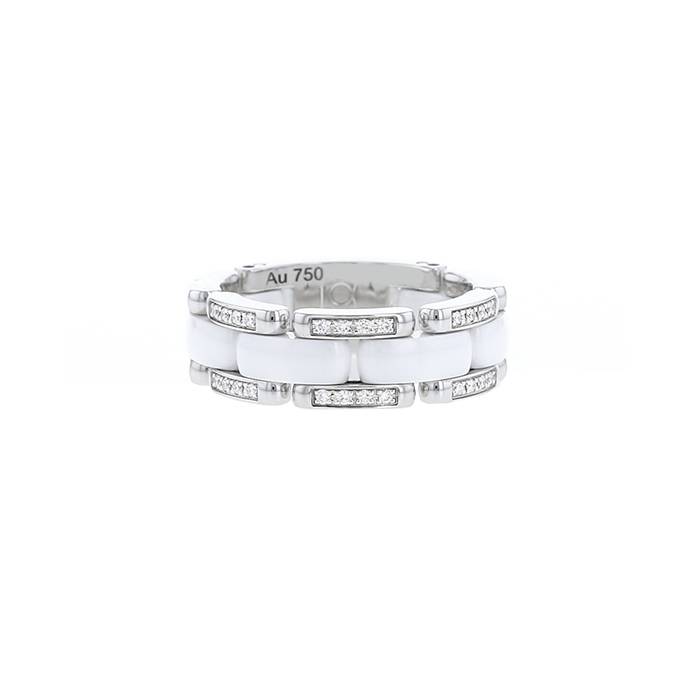 Sortija flexible Chanel Ultra modelo mediano de oro blanco, de cerámica blanca y de diamantes, compuesta de una alternancia de delicados eslabones abombados de cerámica blanca, realzada de un muy bonito engaste liso de oro blanco delicadamente engastado de diamantes de talla brillante.