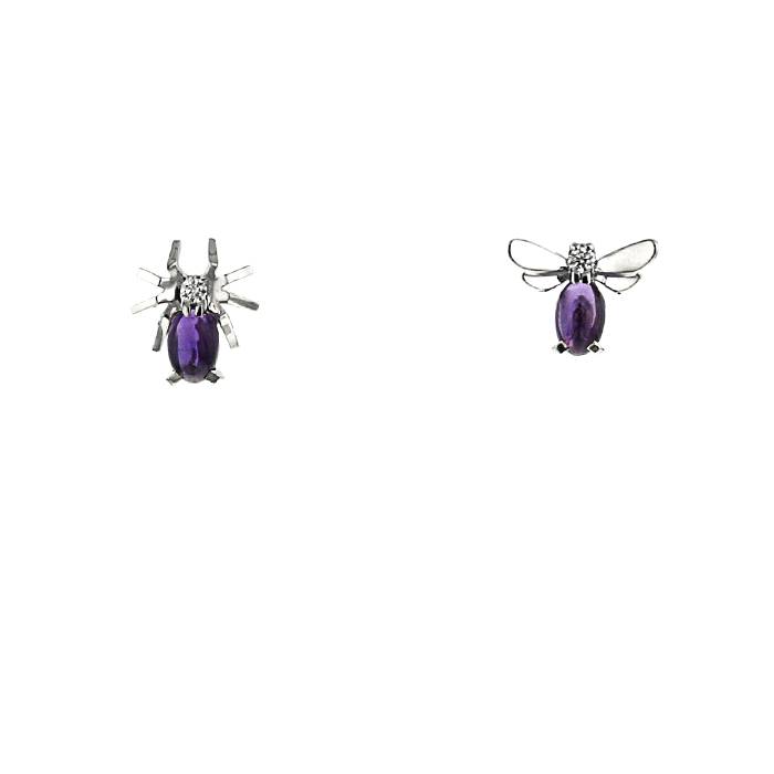 Magníficos pendientes Chaumet Attrape Moi Si Tu M'Aimes de oro blanco, de diamantes y de amatistas, en los cuales figura una bonita araña de oro blanco y una abeja, adornados de 2 preciosas amatistas de talla cabujón, realzados de 2 pequeños diamantes de talla brillante.