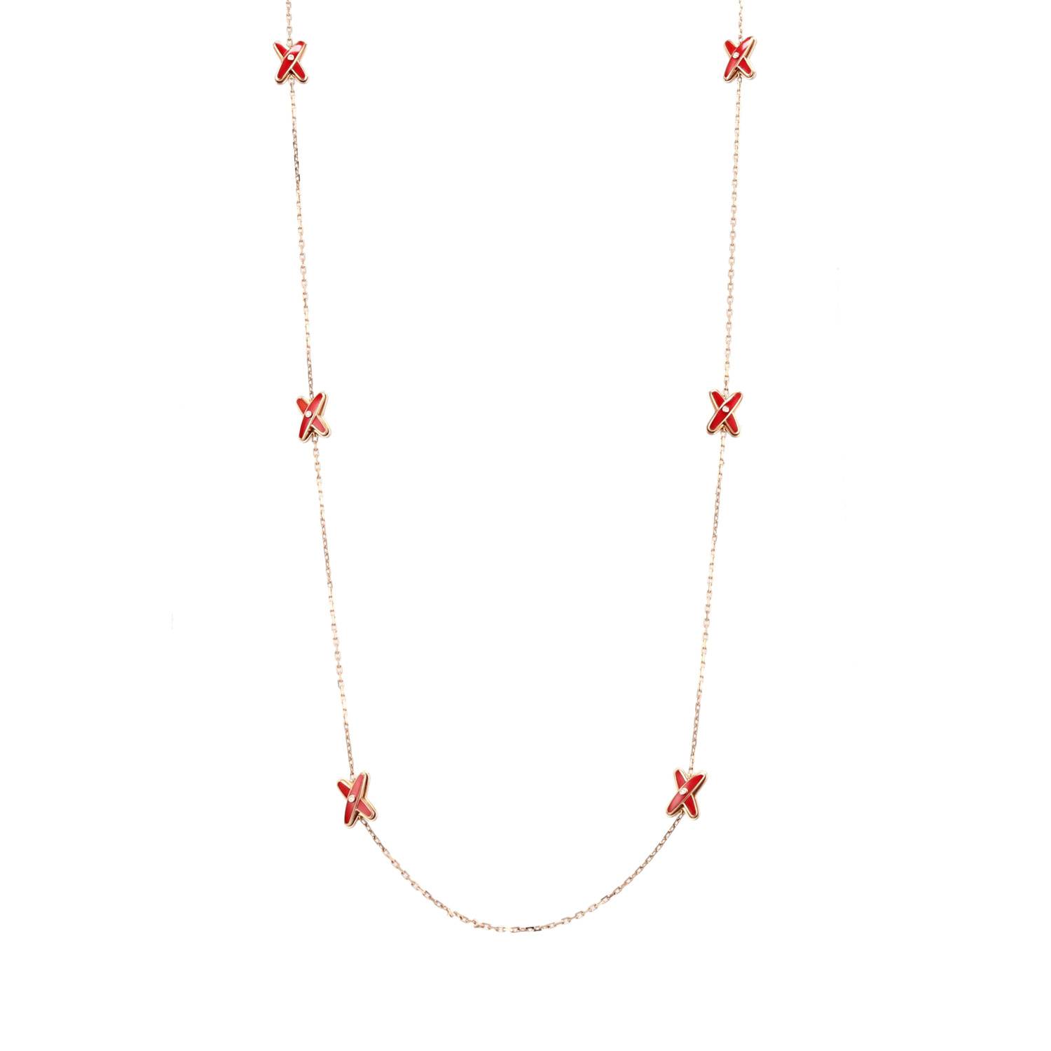 Collar Chaumet Jeux de Liens de oro rosa, de laca, y en diamante, compuesto de una bonita cadena de eslabones encadenados de oro rosa, adornado de delicados motivos cruzados realzados de laca roja engastados de diamantes de talla brillante.