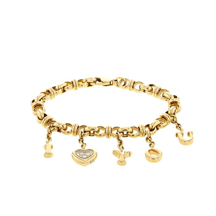 Muy bonito brazalete de la colección "Happy Diamonds" de oro amarillo y diamantes, compuesto de una sucesión de preciosos eslabones redondos gallonados, adornado de 5 delicados colgantes "I Love You" realzados de un corazón calado, realzado en el centro de 3 pequeños diamantes movibles de talla brillante.