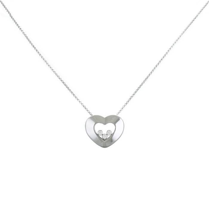 Collar Chopard Happy Diamonds de oro blanco y diamantes, en el cual figura un bonito corazón calado de oro blanco, adornado en el centro de diamantes movibles, sujetado por una delgada una cadena de eslabones redondos de oro blanco.