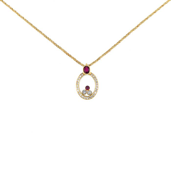 Precioso collar Chopard Happy Diamonds de oro amarillo, de diamantes y de rubíes, compuesto de una elegante cadena retorcida de oro amarillo, que sujeta en el centro un encantador colgante ovalado calado de oro amarillo delicadamente engastado de 25 diamantes de talla brillante realzado de un rubíes ovalado, realzado en el centro de 2 delicados diamantes movibles de talla brillante y de un rubíes.
