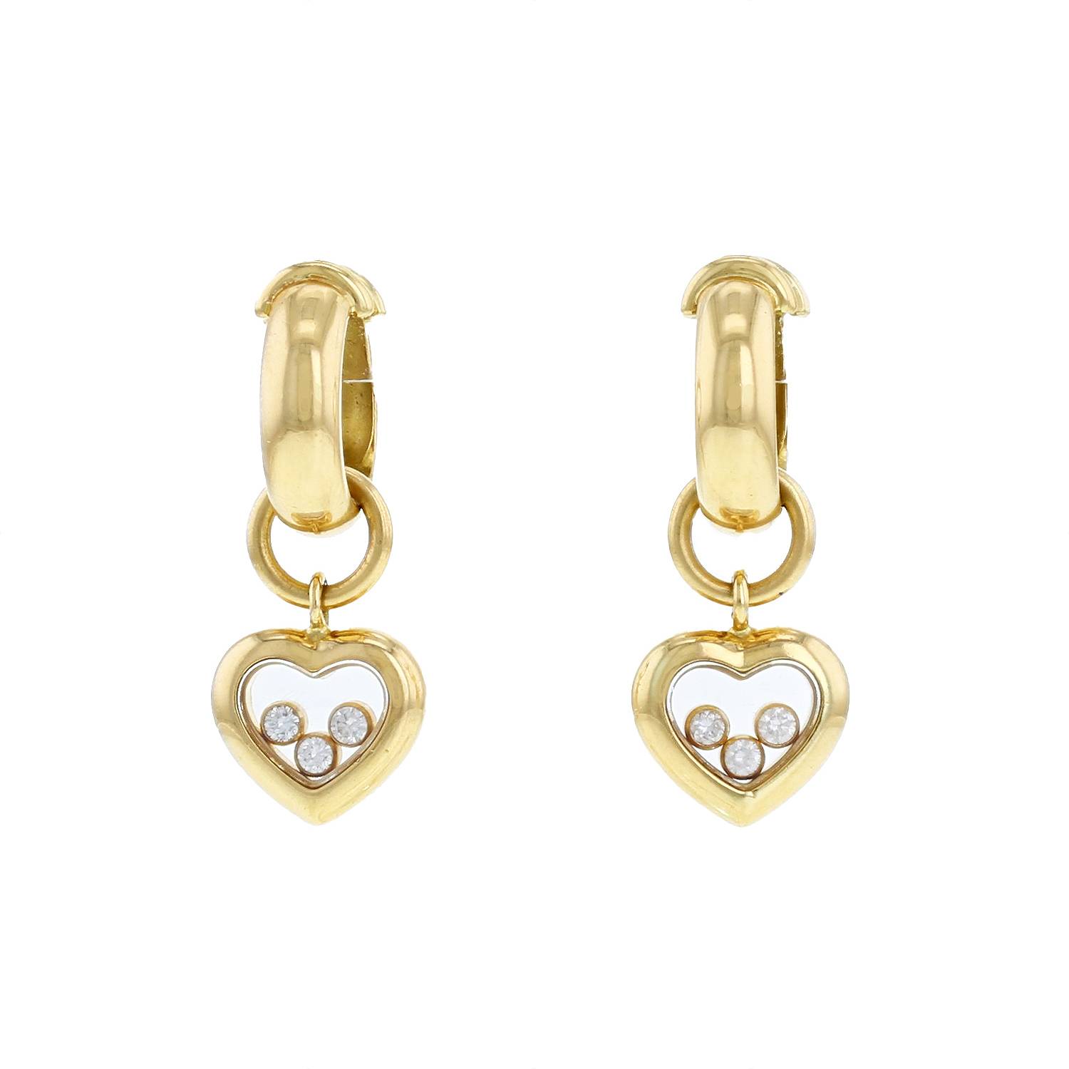 Pendientes Chopard Happy Diamonds de oro amarillo y diamantes, compuestos de intemporales criollas abombadas de oro amarillo, que sujeta de los colgantes movibles calados, realzados en los colgantes de magníficos diamantes movibles de talla brillante de aproximadamente 0.10 quilate.
