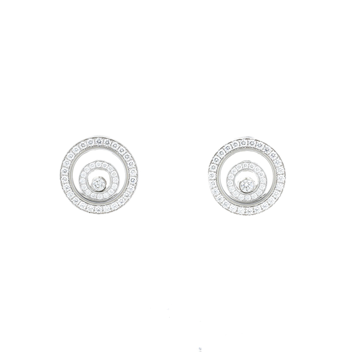 Pendientes Chopard Happy Spirit de oro blanco y diamantes, compuestos de un disco calado de oro blanco delicadamente engastado de diamantes de talla brillante, adornados en el centro de un anillo movible engastado de diamantes de talla brillante, realzados de un diamante movible.