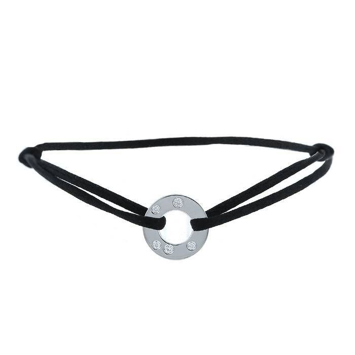 Bonito brazalete Dinh Van Cible modelo pequeño de oro blanco y diamantes, adornado de un diseño redondo de oro blanco, realzado de pequeños diamantes de talla brillante, sujetado por un cordón de seda negra.