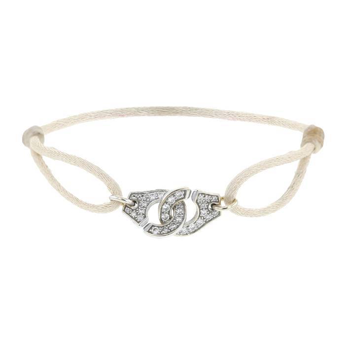 Precioso brazalete Dinh Van Menottes R10 de oro blanco y diamantes, en el cual figura una par de esposas entrelazado de oro blanco elegantemente pavimentado de diamantes de talla brillante 0.30 quilate de de aproximadamente, sujetado por un cordón beige.
