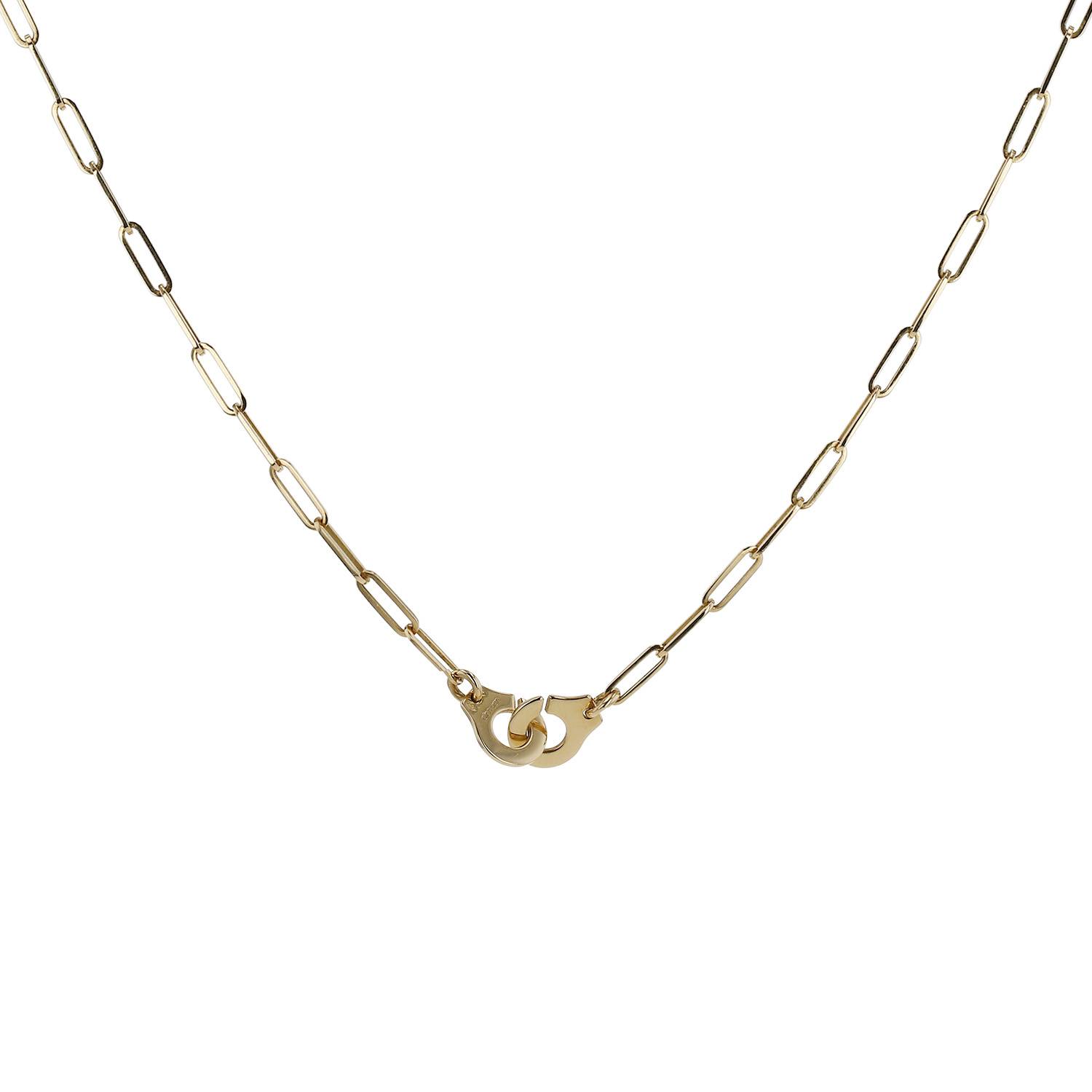 Collar Dinh Van Menottes R10 de oro amarillo, en el cual figura una par de esposas entrelazado, sujetado por una cadena de oro amarillo.