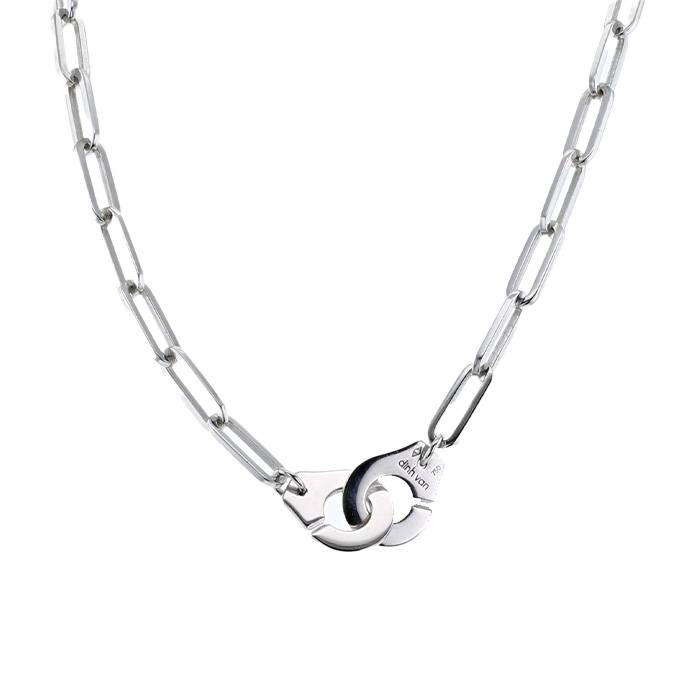 Collar Dinh Van Menottes R15 de oro blanco, compuesto de una par de esposas entrelazado de oro blanco, realzado de una cadena de oro blanco.