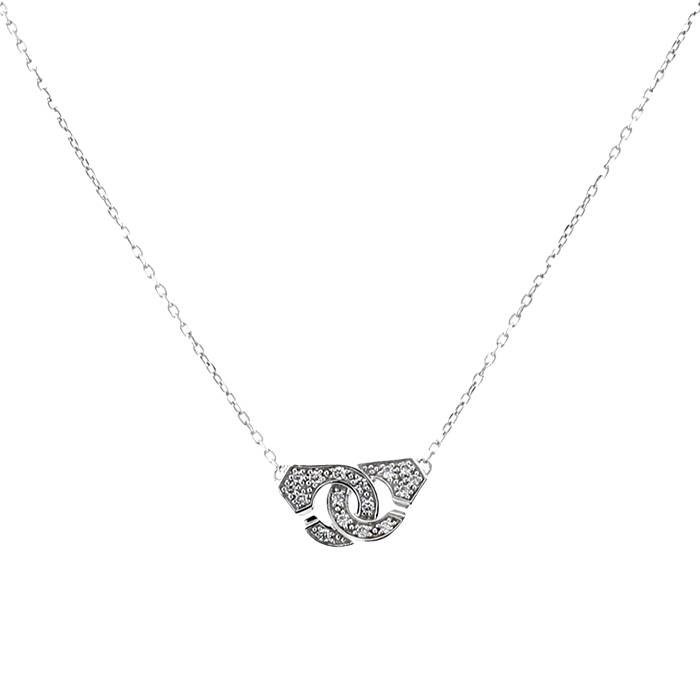 Encantador collar Dinh Van Menottes R8 de oro blanco y diamantes, en el cual figura una delicado par de esposas entrelazado enteramente pavimentado de diamantes de talla brillante, sujetado por una cadena de oro blanco.