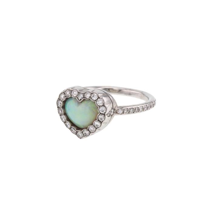 Encantadora sortija de la colección "Happy Birth" de oro blanco, compuesta de un corazón de ópalo, realzada de un borde enteramente pavimentado de diamantes de talla brillante.