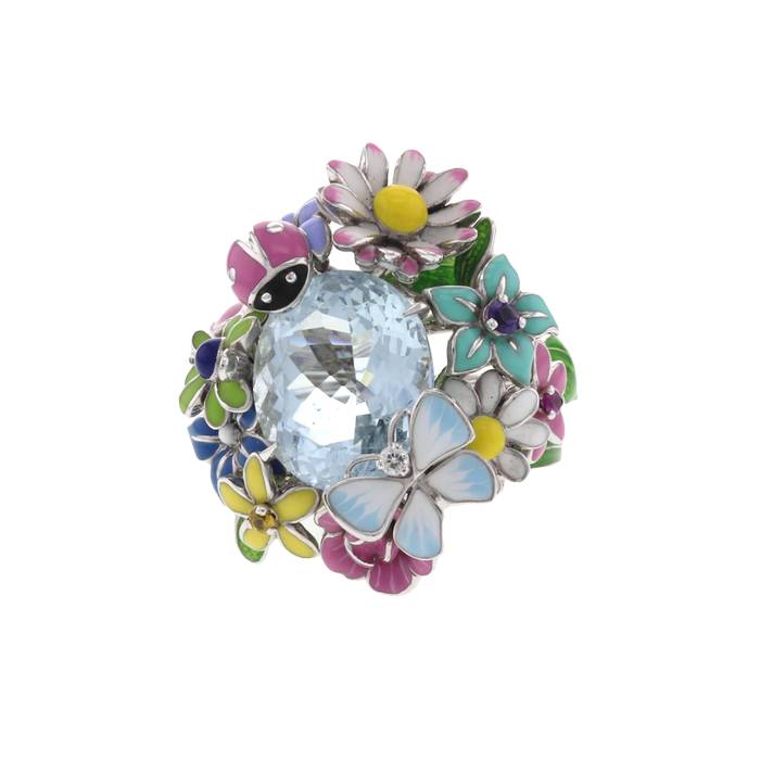 Magnífica sortija de oro blanco, estilizando un ramo de flores esmaltado y una mariquita y una mariposa, adornada en el centro de una aguamarina de talla cojín rodeada de una citrina, realzada de una amatista y de zafiros.